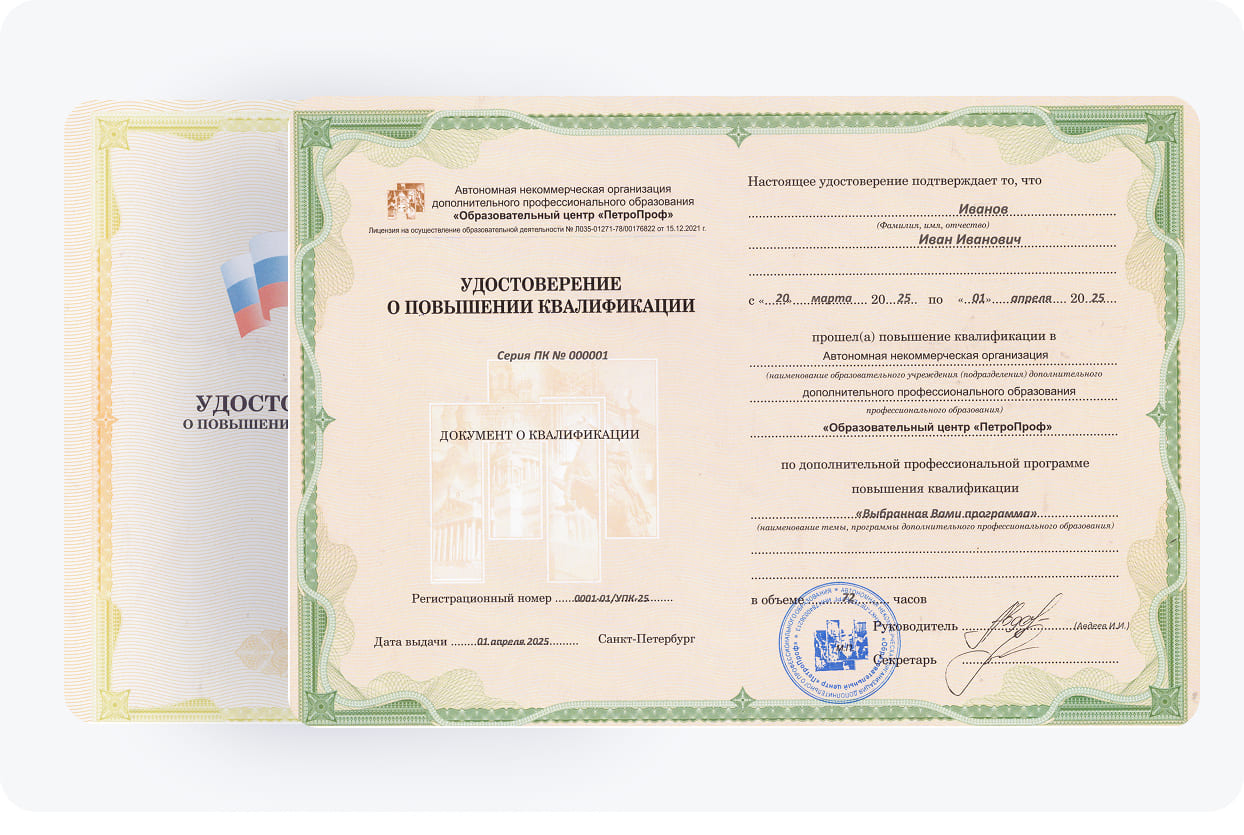 По итогам прохождения курса участники получают удостоверение о повышении квалификации (УПК), которое свидетельствует о получении ими новой квалификационной степени. Данный документ о переобучении существенно улучшает перспективы вашей профессиональной карьеры и делает вас конкурентным специалистом на рынке труда, а значит, вы легко сможете получить повышение или устроиться на новое место работы.